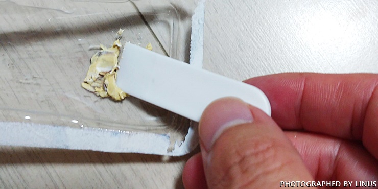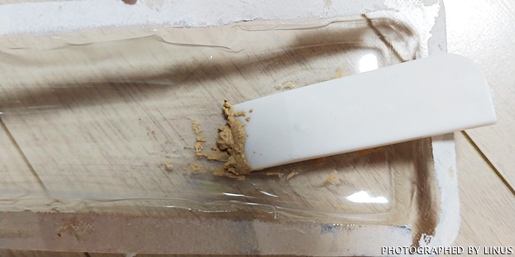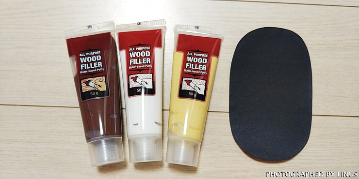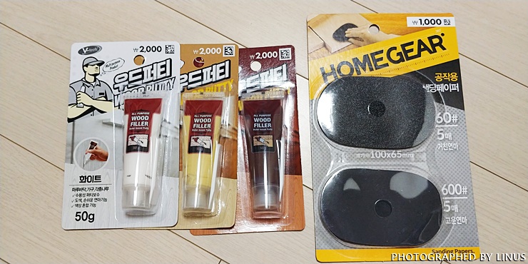 그래서 인근 다이소에서 사 온 다이소 우드퍼티, 화이트, 네추럴 다크월넛 3가지 색상이 있는데 보수 부위가 단색이라면 상관이 없지만 좀 애매한 색상이라면 섞어써야하기 때문에 필자의 경우는 3가지를 다 구입했다. 가격은 색상당 2천원, 그리고 보수 후 후처리(?)를 위해 샌딩페이퍼(사포)도 같이 구입하여 도합 7천원 소비!