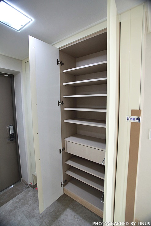 현관문쪽으로 가서 신발장 안을 체크해보자. 빠진 부속품은 없는지 옆을 고정해주는 나사나 핀은 빠진게 없는지 꼼꼼히 체크. 사진에는 없지만 현관 입구 강화마루 바닥이 들떠있어서 체크.