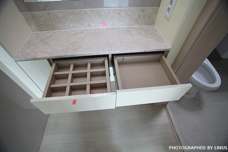 이제 붙박이 화장대 체크. 다 좋은데 대리석 상판이 길게 금이 가 있다.ㅠㅠ; 통채로 갈아야할듯.