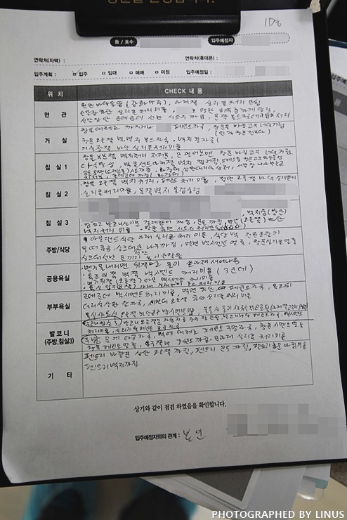 이게 바로 입주전 아파트 사전점검 체크리스트. 꼼꼼히 체크를 해야 아파트 입주전후 하자 보수를 받을수있다. 물론 아파트 입주후에도 하자보수가 계속 이루어지나 하자보수 특성상 집으로 보수하시는 분들이 계속 방문해야하고, 먼지 날리고 가루 날리고해서... 기왕이면 입주전에 꼼꼼하게 체크해서 마무리하시는게 깔끔하다. 아파트 입주를 준비하고 계신분들의 경우 보통 입주 이사 날짜 잡기, 이삿짐 센터 계약, 새 가구 구입, 혹은 중도금, 잔금 대출, 입주 청소 등에 대해서는 신경을 많이 쓰시지만 사전점검을 많이 신경쓰시지 않는 분들이 많은데... 내가 살집을 위해서라도, 그리고 입주 후 발생할수있는 또다른 하자보수에 시달리지 않기 위해서라도 미리미리 꼼꼼하게 챙겨두심이 어떨지...^^ 이상으로 친절한 라이너스씨의 '아파트 입주 전 사전점검 직접해보니...'편 끝~