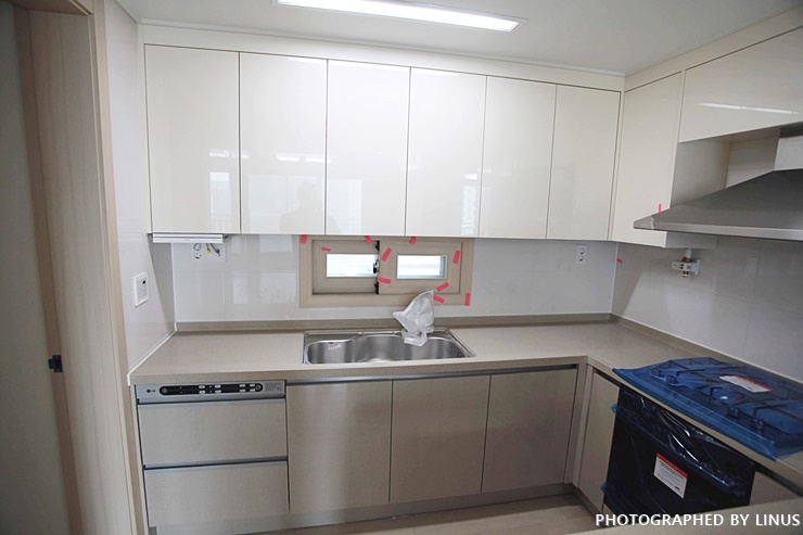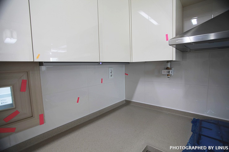 이제 부엌쪽 체크. 환풍기는 잘 돌아가고, 삼성 빌트인 가스 레인지와 전기 레인지 겸용 오븐이 밀봉된채로 잘 설치되어있다.