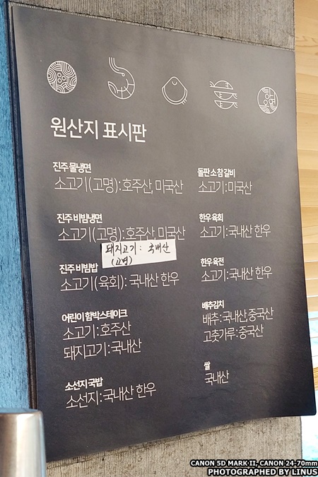 표지판의 모습. 진주 물냉면은 9천원, 진주 비빔냉면은 9천5백원, 어린이 함박스테이크 8,900원, 한우 육전 19,500원, 한우 육회는 25,000원으로 가격은 일반 냉면이나 밀면집에 비해 약간 더 비싼편.