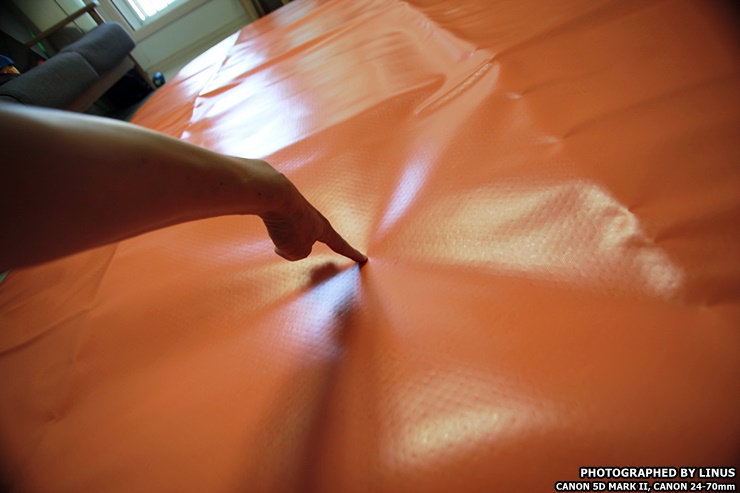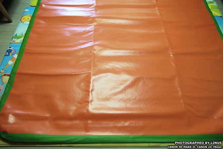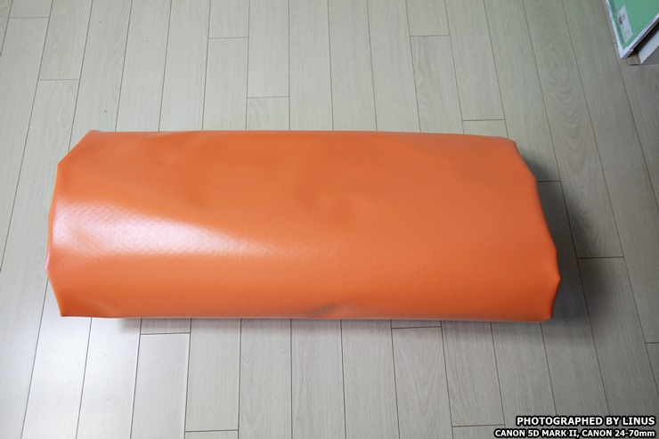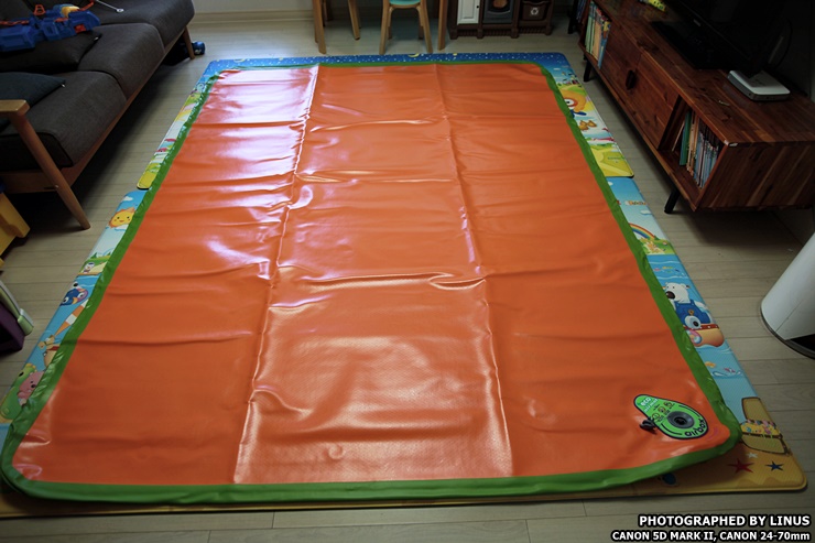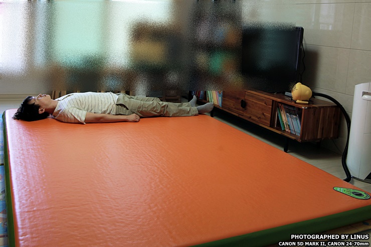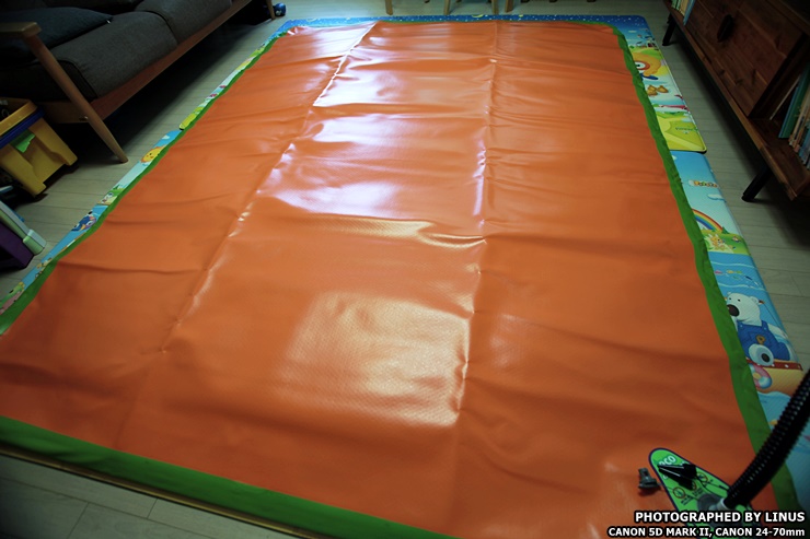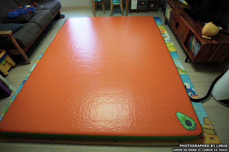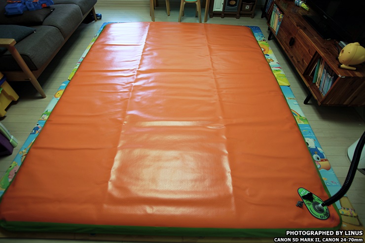 거실 바닥에 펼쳐서 깔아보았다. 가로 260, 세로 200으로 광활하다. 4명이 편안하게 잘수 있을 정도의 크기라하여 별칭이 와이드 포맨이다. 참고로 에어박스사의 에어매트는 사이즈가 다양한데 트윈(145x200), 트리플(200x200), 와이드트리플(220x200), 포맨(240x200), 와이드포맨(260x200), 파이브맨(280x200), 스페셜(300x200)의 사이즈가 있으며... 바닥 두께는 5, 10, 20cm으로 다양하다. 심지어 에어매트 브릿지라고해서 에어매트를 마치 침대처럼 올리는 받침대도 있다고...ㄷㄷㄷ; 보통 10cm를 가장 많이 구입하고, 극동계의 경우 냉기가 올라오는걸 방지하기위해 20cm를 선호하시는 분도 있다고한다.