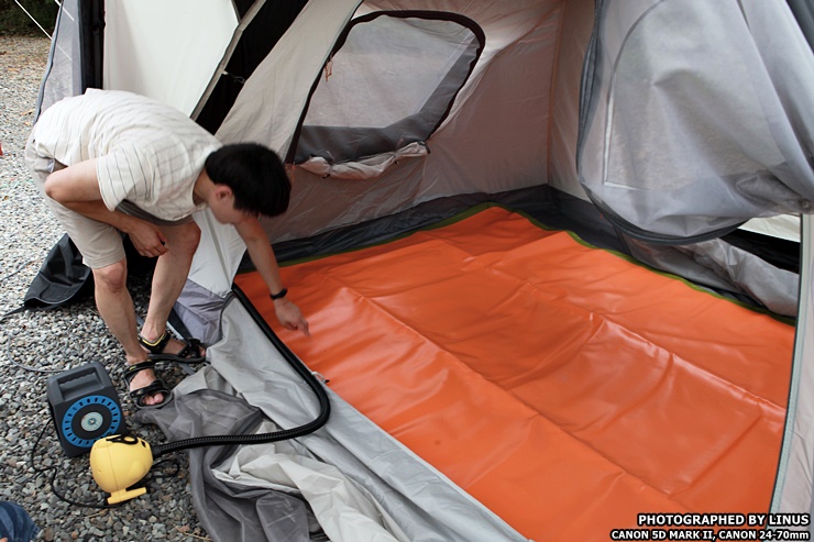위잉~ 소리가 나면서 튜브에 바람이 들어갑니다. 소음이 어느정도는 있는 편인데... 뭐 어차피 캠핑장에 가면 팩박는 소음도 그 못지 않으니... 물론 야간에는 매너있는 캠퍼가 되기위해 자제가 필요하다.^^;