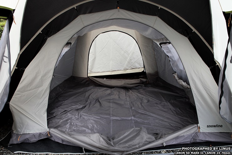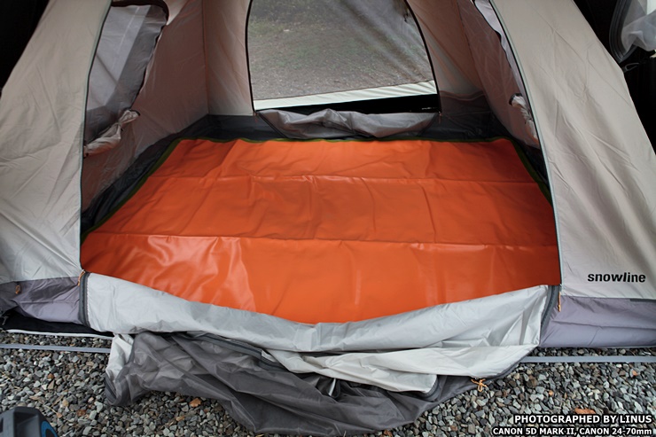 이제 캠핑장에서 사용해보도록하자. 필자의 텐트인 스노우라인 미라클 패밀리 텐트. 4인용 텐트로 리빙쉘(앞쪽 리빙공간과 뒷쪽 이너텐트가 결합된 형태) 타입이다. 아직까지 팩을 완전히 치지 않아 흐느적 거린다.^^;