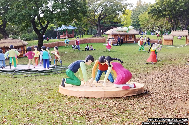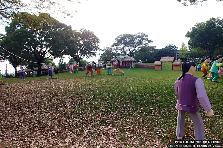 자세히 보니 민속놀이다. 뒤편으로는 팽이돌리기, 그 앞에는 줄다리기.