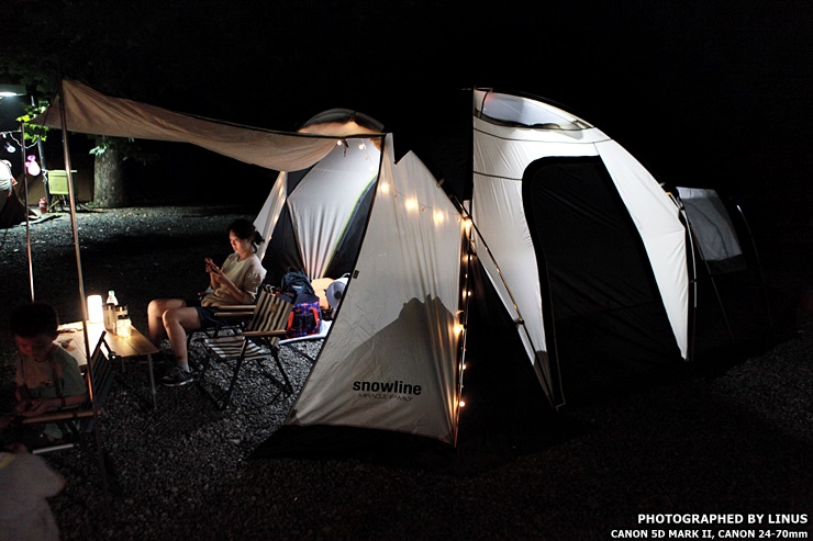 밤에 찍은 스노우라인 미라클 패밀리의 모습. 텐트 전면으로 작은 타프가 내장되어있어 평소때는 타프를 올려 그늘막처럼 사용하고 밤에는 타프를 문처럼 닫아준다. 미라클 패밀리는 색상이 2가지인데 하나는 카키와 어두운 색이 섞인 색상. 또다른 하나는 필자의 텐트처럼 베이지색과 어두운색이 섞인 색상이다. 개인적으로 베이지가 더 깔끔해보여 선택했다.^^; 그러고보면 재작년엔 퍼스트캠프의 원터치 텐트, 그리고 작년엔 버팔로의 그늘막텐트에 이어 올해의 미라클 패밀리까지... 라이너스씨의 텐트 세계(?)에도 많은 발전이 있었다.^^;