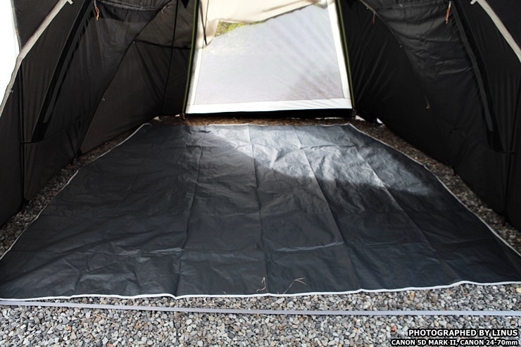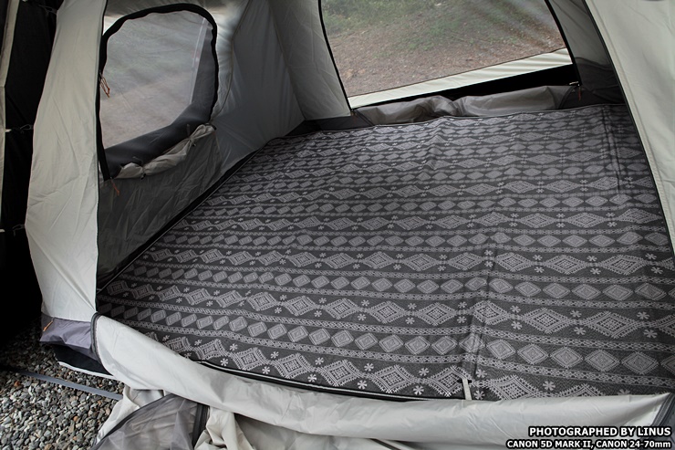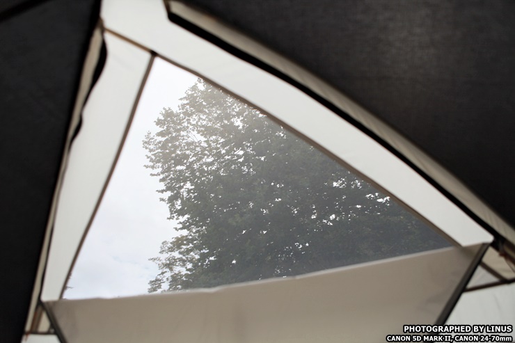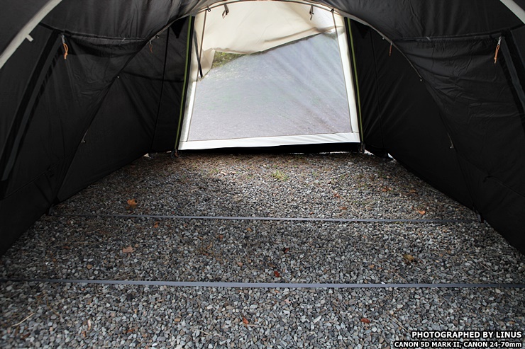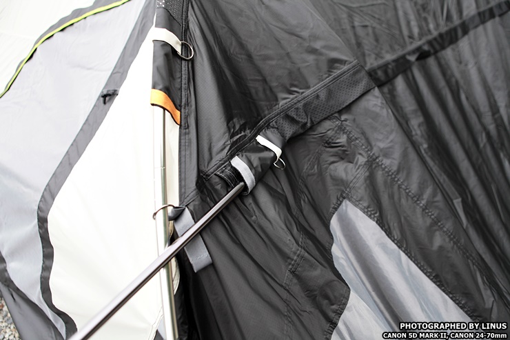 전실 위에는 이렇게 벤틸레이션이 설치되어있어 환기를 도와준다. 이게 별거아닌거 같아 보이지만 일반적으로 텐트 본체 외부공기와 이너텐트 사이의 공기차를 낮아지게해 결로를 방지해주고, 특히 동계캠핑때 난로나 팬히터를 틀때 공기순환과 환기를 도와주는 역할을한다.