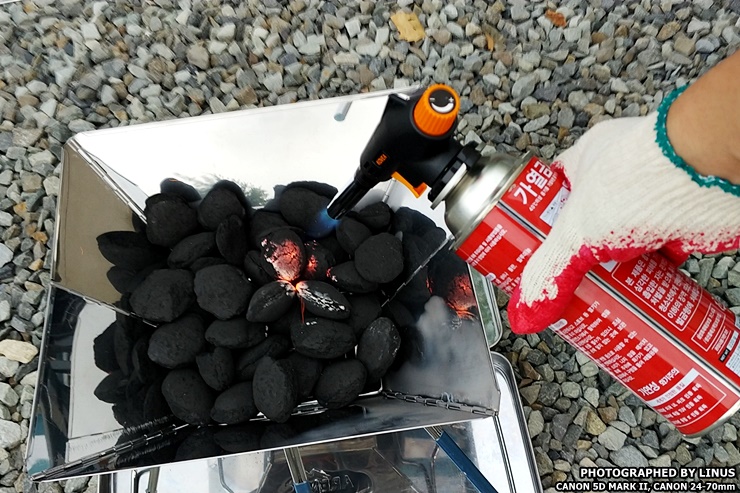 자, 실제로 필드(?)로 나가 사용해보도록하자. 지금부터 친절한(?) 라이너스씨와 함께하는 숯에 쉽게 불붙이는법 꿀팁! 준비물은 화로대와 숯, 숯집게, 바베큐장갑(없으면 목장갑), 토치, 부탄가스, 차콜스타터(이건 없어도 그만).