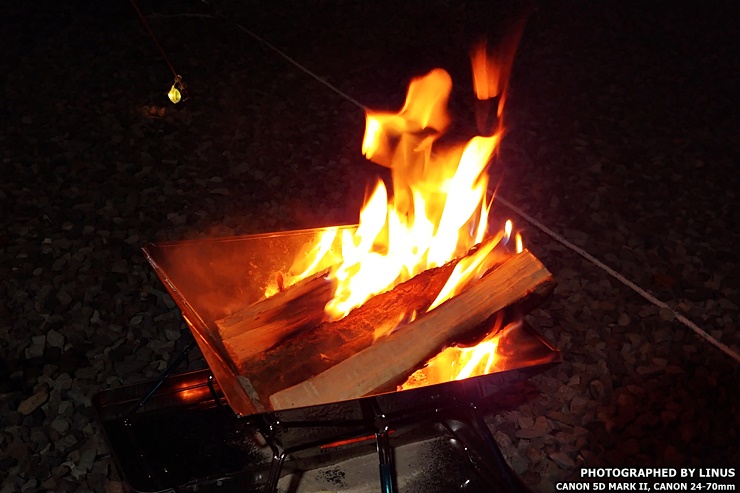 흡사 휘몰아치는 폭풍(?)과도 같은 식사시간이 끝나고 나면 불멍 타임(주: 불멍이란 불을 멍때리고 쳐다본다고해서 붙여진 캠핑 용어)이다. 숯에 불을 붙이는것만큼 어렵지 않다. 숯불이 어느정도 남아있을때 그냥 가지고 있는 장작을 밀어넣으면 자연스럽게 불이 타오른다.
