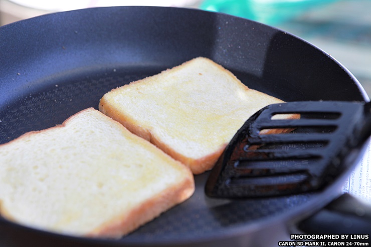아침은 버터에 바삭하게 구워 딸기잼을 바른 식빵! 빵이 노릇노릇 구워진다.