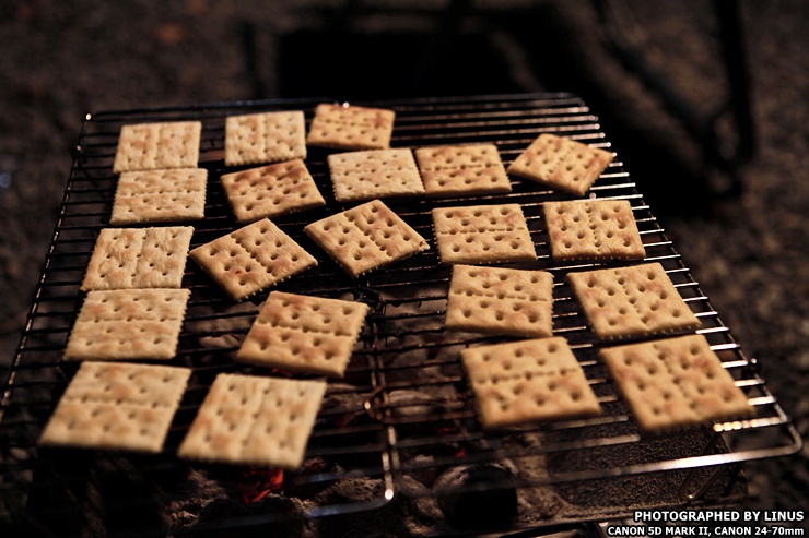 이제 한바퀴 돌았으니 배도 고프겠다. 참 크래커를 숯불에 구워보자. 노릇노릇 잘 익어간다. 커피와 함께 먹으면 꿀맛!
