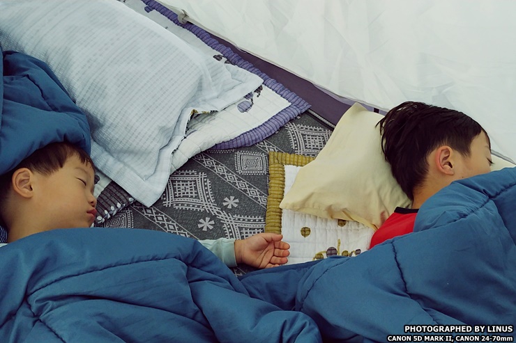 다음날 아침이 밝았다. 오늘 새벽 최저 기온은 5도. 추위를 많이 타는 라이너스씨는 153 전기 매트를 깔았음에도 어찌나 추운지 덜덜 떨면서 잤는데, 열이 많은 뭉이와 아이들은 괜찮았다고...ㄷㄷㄷ; 다음엔 꼭 신일 900시리즈 팬히터를 가지고 오리라.