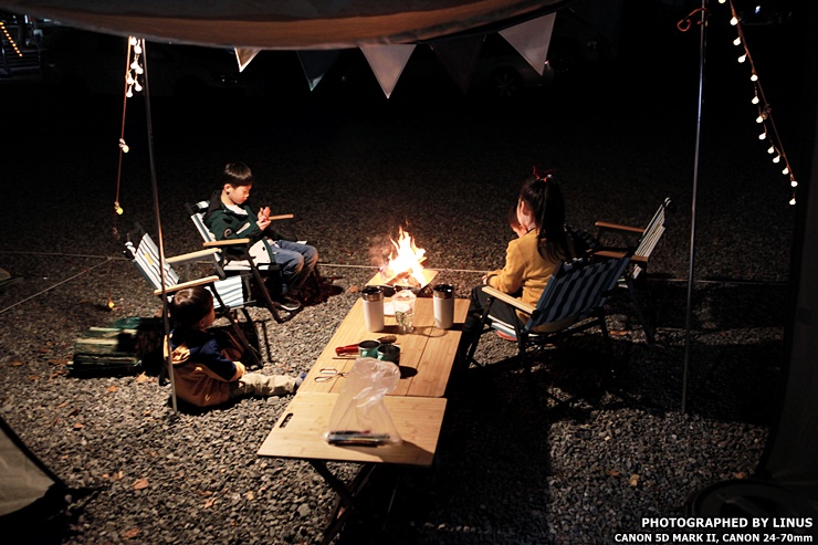 친해진 이웃 캠프 남매를 초대해 불멍+아까 구운 크래커를 먹고있다.