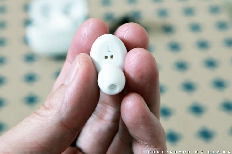 수디오 톨브 이어폰의 모습. 아래쪽 구멍이 사운드가 나오는 부위이며, 'L'자 밑에 2개의 점이 충전독과 접촉하여 충전이 이루어지는 부분이다.