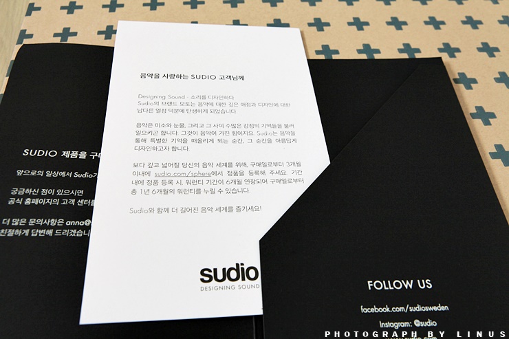 이렇게 간단한 편지와 함께 수디오의 AS 워런티 정책에 대해 알려주고있다. 보통 수디오 제품의 경우 1년의 무상보증 기간이 있지만 구매일로부터 3개월 이내에 정품 등록을 하면 워런티 기간이 6개월 연장된다고... (www.sudio.com/sphere)