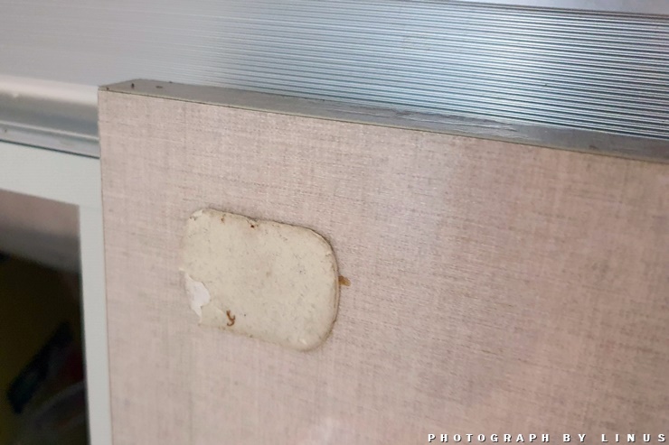 이제 싱크대 윗쪽에 붙어있는 스티커 자국. 위쪽은 테이프로 붙여놨더니 결국 저 모양이 되었고, 아래쪽은 문열림 방지 가드를 설치해놨는데 다 뜯어져서 엉망이 되었다.