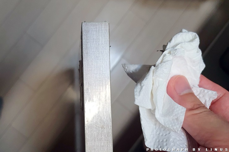 아까전 처럼 다이소 스티커 타르 제거제를 뿌리고 30초 뒤 키친타올로 슥슥 문질러주면...