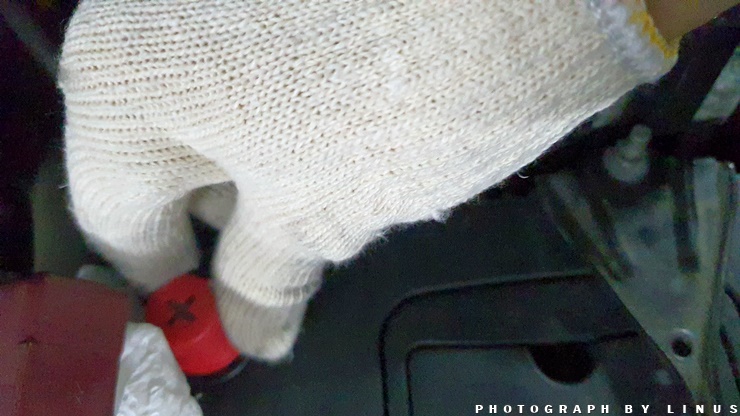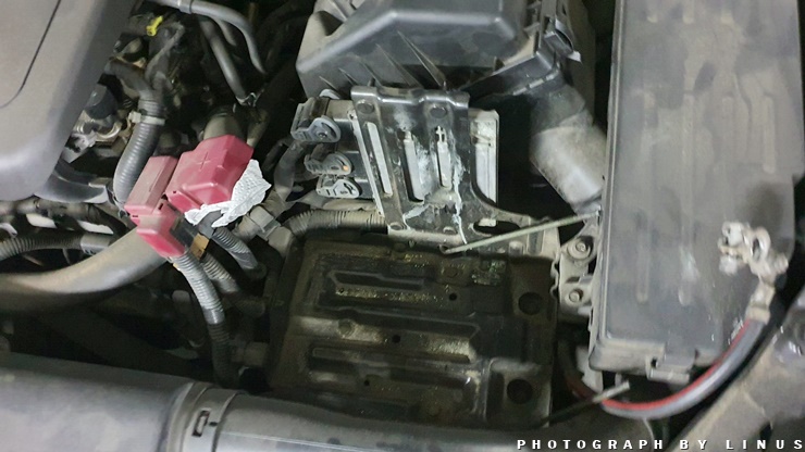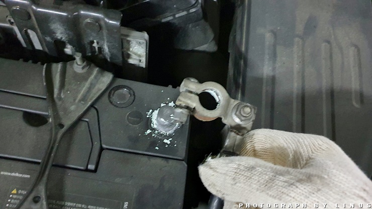 분리 완료. 이때 플러스(+)단자가 차체에 닿으면 위험할수 있으니 닿지 않도록한다.