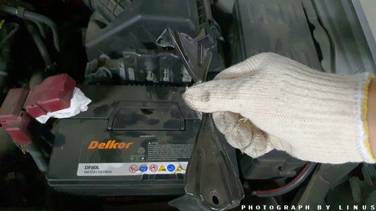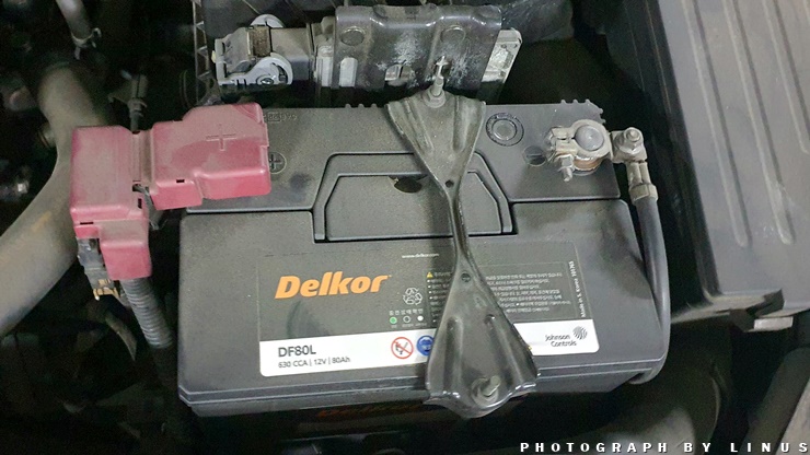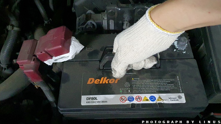 그리고 오른쪽을 보면 이렇게 배터리가 자리 잡고있다. 생각해보니 타지에서 급하게 출동 서비스로 교체한다고 교환비용이 10만원이나 들었던 기억이...ㅠㅠ 기존에 사용했던 배터리는 델코 DF80L. 교체할 새 배터리를 인터넷으로 구매하실 분이라면 본인의 자동차에서 배터리 용량을 확인 후 구매하시면 보다 좋을듯하다.
