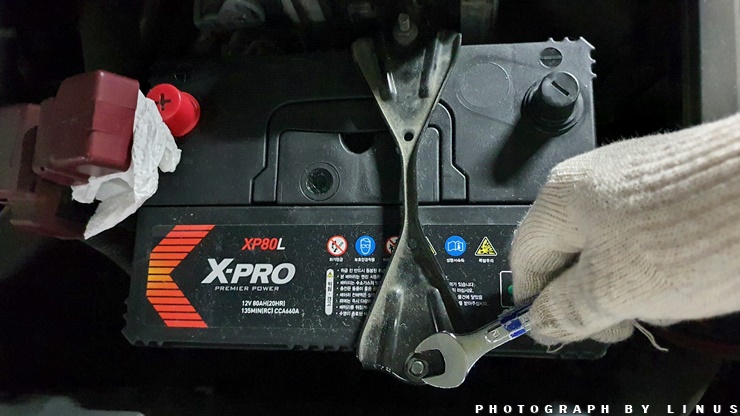아까전 배터리를 분리할 때와는 역순으로 플러스(+)단자를 먼저 끼우고, 마이너스(-)단자를 끼워준다.(순서 주의)