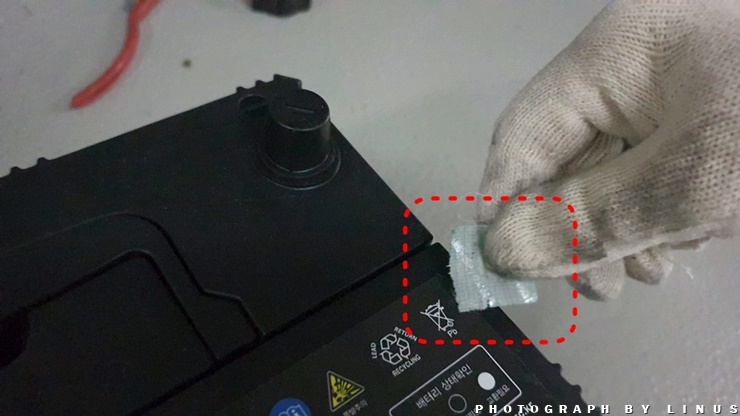 이건 배터리액 누수 방지를 위해 붙어있는 테이프로 안떼고 그냥 설치하시면 큰일(?) 난다. 새 배터리 옆에 붙어있는 초록색 테이프를 필히 떼낸다.