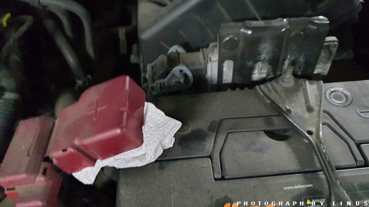 필자의 경우는 아예 플러스(+)단자가 차체에 닿지 않게끔 두꺼운 키친타올로 둘둘 말아버렸다.^^;