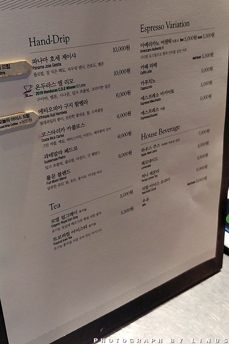 테라로사 메뉴판의 모습. 핸드드림은 파나마 호세 게이샤, 온두라스 엘리모, 오늘의 아이스 드립은 에티오피아 구지 함벨라. 차는 로열 얼그레이, 트로피컬 아이스티, 에스프레소는 아메리카노 어센틱, 카페라떼, 카푸치노, 마키야토, 그리고 아이들을 위한건지 주스, 레모네이드, 아이스 코코아, 우유 등도 있다. 라이너스 씨와 뭉이님은 올때마다 아이스 아메리카노 어센틱과 아이스 카페 라테를 마신다. 얼죽아라던가...^^;