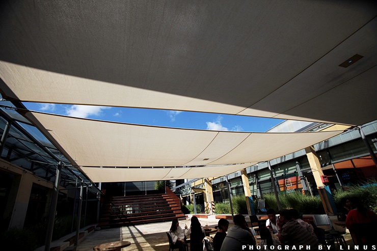 커피숍 밖으로 나가면 야외 테이블도 있다. 앞쪽은 버스킹 등 공연이 가능한 무대이고, 가운데는 햇살을 막아주는 타프가 쳐져있는 야외 테이블, 그 뒤편으로는 역시 철제로 된 공연객석(?)이 있다.