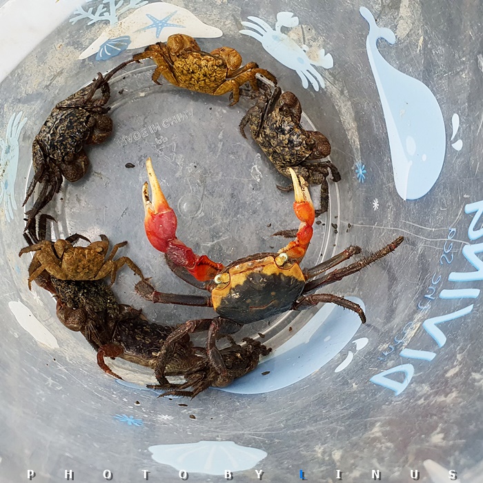 작은 게도 있고, 고동도 있는데... 그중 큼지막하고 현란한 색상을 자랑하는 도둑게가 인상적이다.