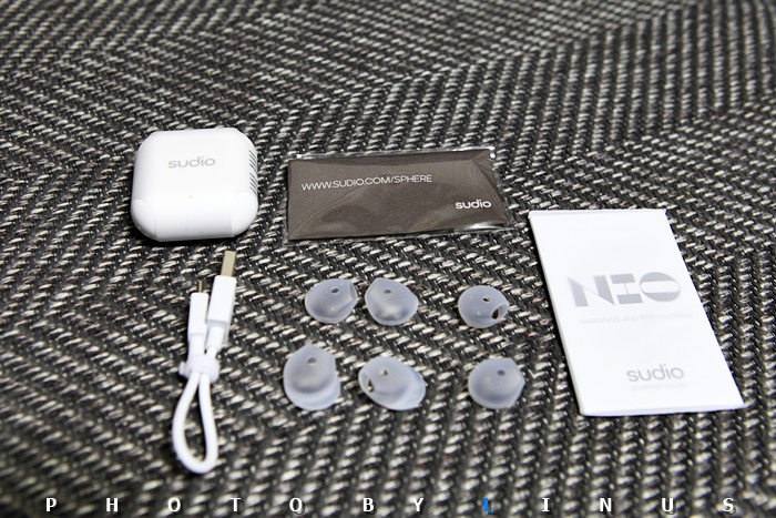 수디오 니오의 이어폰 케이스겸 도크와 워런티 카드, 설명서, 사이즈별로 들어있는 윙팁, 충전잭이 들어있다. 이번 케이블 역시 수디오 엣트 이후 적용된 C타입이다.