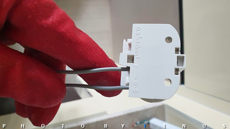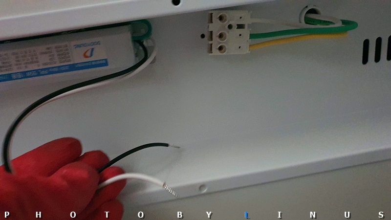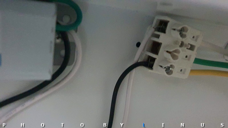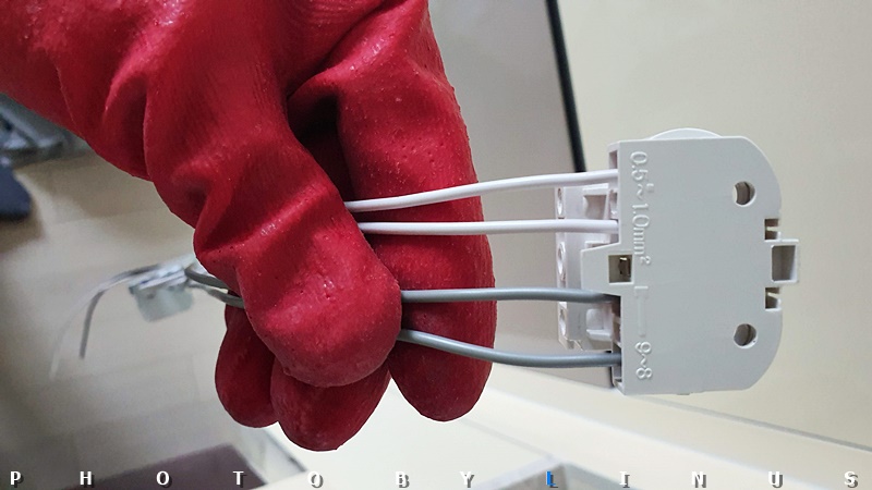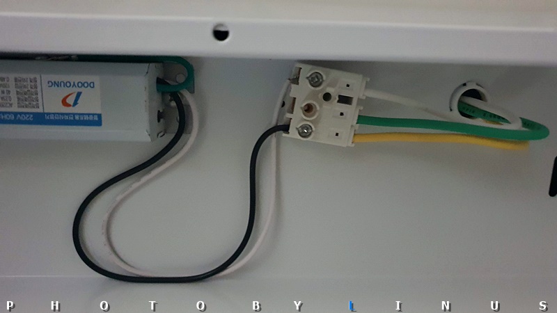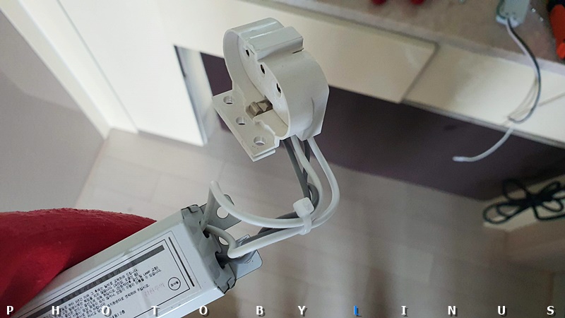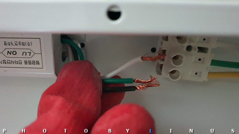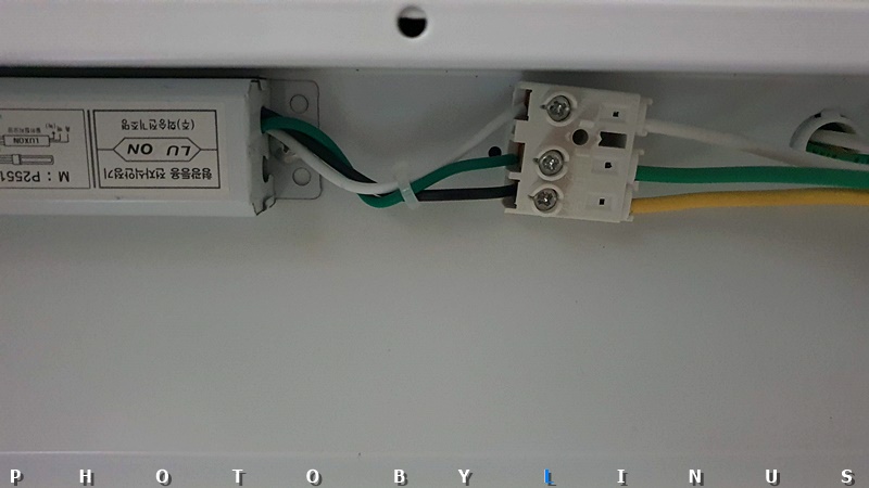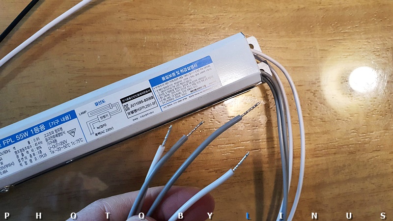 가까이서 보면 이런 모습. 원래 안정기와는 달리 가운데 초록전선(접지선)은 안정기 뒤로 붙는 타입이라 따로 넣지 않았다. 혹시 초록선 피복이 밖으로 노출되는 타입이라면 원래대로 가운데에 넣어주시면된다.