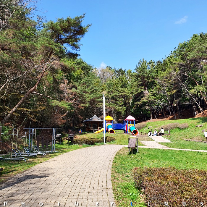 곳곳에 운동기구가 있고 저 멀리 놀이터도 보인다.