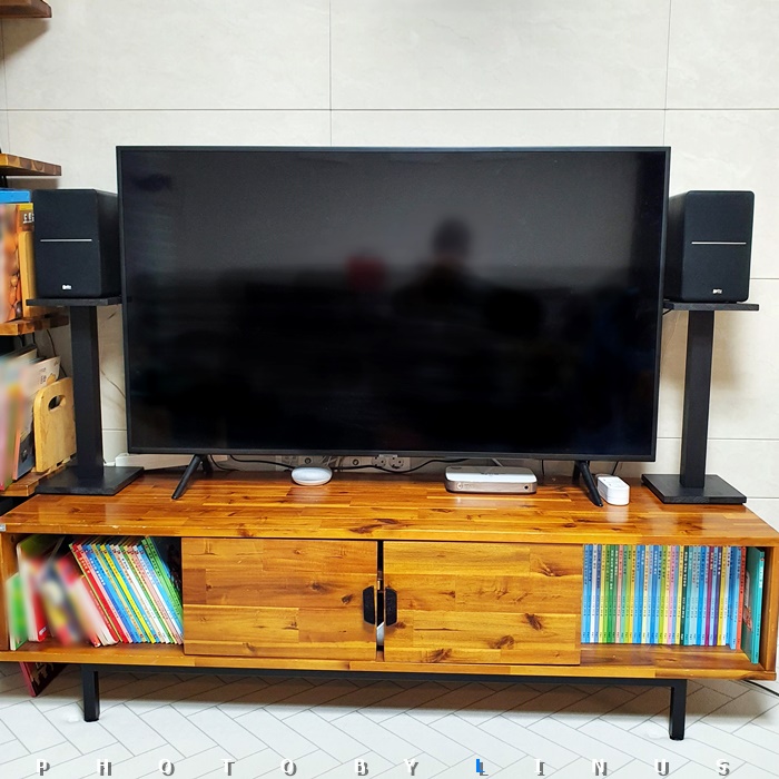 측면에서 본 모습. TV장 위의 TV, 스피커, 스피커 스탠드까지 올 블랙으로 깔맞춤하니 통일감이 있어 보기 좋다.^^