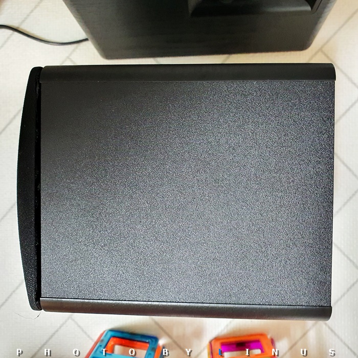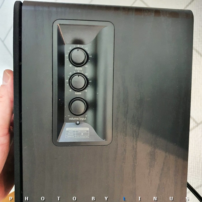 측면부에는 이렇게 조절 버튼이 달려있다. 아래는 볼륨 버튼인데 좌우로 조절해서 음량을 조절할 수 있는데 음량은 전원을 켜면 기본 20으로 시작하고, 최소 0, 최대 40까지로 미세 조정이 가능하다. 맨아래 버튼을 누를때마다 맨아래의 불빛이 바뀌는데 붉은빛이 나오면 옵티컬, 코엑시얼 입력, 파란빛이 나오면 블루투스 입력, 초록색이 나오면 라인 1, 라인 2 입력이 선택된 것이다. Treble(고음)과 Bass(저음)을 돌려서 미세 조절이 가능한데 TV 스피커로 사용시 대사나 대화소리를 보다 선명하게 듣고 싶으시면 Treble(고음)을 4 정도로 맞추시면 좋다. 그 이상 올려보니 음이 좀 뾰족해 진달까...^^;