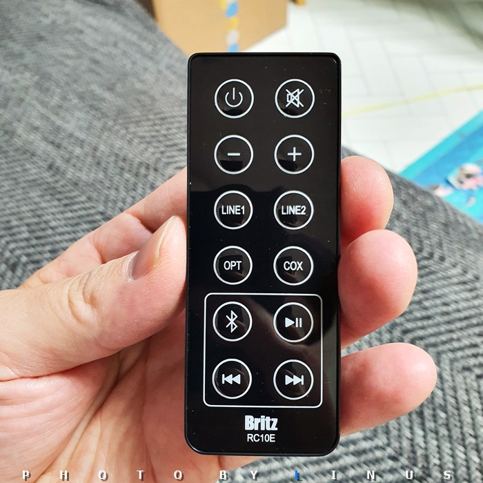 옵티컬 광케이블 연결의 단점이 TV와 연결시 스피커 볼륨이 TV 리모컨으로 조절이 안된다는 것. 그래서 브리츠 BR-1600BT 스피커는 리모컨(RC10E)이 함께 동봉되어있다. 여기서 전원과 음소거, 각 모드 설정, 재생, 일시정지 곡 넘김등이 가능하다. 하지만 TV 리모컨과 LG 유플러스, KT 올레, SKT BTV등의 셋톱 박스 등 무려 3개의 리모컨을 사용하는 게 불편하신 분들은 학습 리모컨을 구입하셔서 통합해서 사용하시는 것도 하나의 방법이 될듯.
