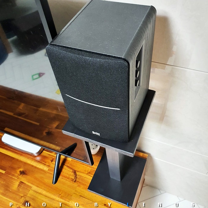 필자가 자작한 북쉘프 스피커 스탠드 위에 스피커를 올려보았다. 북쉘프 스피커를 TV용으로 사용하다보면 대사가 뭉게지거나 음질이 좋지않다고 느낄때가 있는데 그건 스피커의 위치가 좋지 않기 때문. 고음질의 스피커를 사용하는 것 이상으로 중요한건 스피커의 위치인데 스피커의 가장 적합한 높이는 소파에 앉았을때 트위터가 사람의 귀쯤에 위치하면 가장 좋은 음질로 소리를 들을 수 있다. 이쯤에서 브리츠 BR-1600BT 북쉘프 스피커 음질에 대해 평하자면... 전체적인 밸런스가 좋고 45W의 강력한 출력에서 뿜어져 나오는 입체감있는 고음질 또한 귀를 즐겁게 해준다. 고음과 베이스 조절 버튼이 달려있어 베이스를 적당히 조절해주면 둥둥거리는 입체감이 훨씬 커진다. 따로 별도의 우퍼가 필요 없을 정도, 특히 전쟁 영화나 게임 플레이시 박진감 넘치는 사운드를 선사해준다. 물론 층간소음을 유발하면 안되니 밤에는 베이스를 줄이고, 낮 동안 영화를 감상합시다.^^;(공익 광고 협의회)