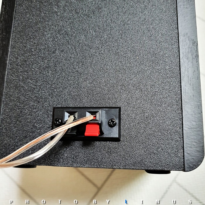 오른쪽 스피커 뒤편에 선을 연결해서 반대쪽 왼쪽 스피커에 연결해주면 스피커끼리의 연결은 끝난다.