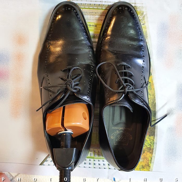 필자의 비운의 구두. 길이 사이즈는 딱 맞는데 발볼이 너무 좁다. 옆의 발 모양으로 생긴 이상한 도구는 바로 제골기다.