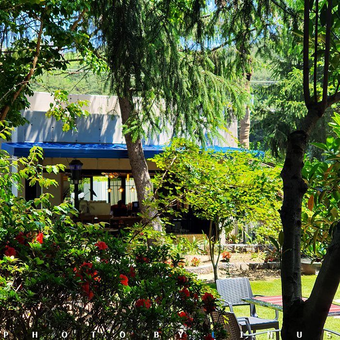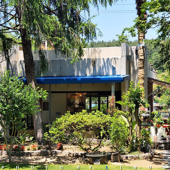 아름다운 나무와 꽃들 뒤로 아스라히 보이는 커피숍 전경.
