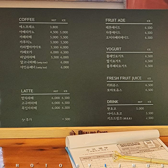 메뉴로는 카라멜마끼아또ㆍ달고나라떼ㆍ아인슈페너 등의 커피류, 말차라떼ㆍ고구마라떼ㆍ흑임자라떼등 라떼류, 레몬에이드ㆍ자몽에이드ㆍ오미자베리에이드등의 과일 에이드, 플레인요거트ㆍ딸기요거트ㆍ블루베리요거트 등의 요거트류, 키위쥬스ㆍ토마토주스 등의 생과일주스류, 핫초코ㆍ아이스초코ㆍ키즈드링크(뽀로로 음료소)등의 기타 음료류 등이 있는데 가격은 대체로 5~6천원대로 형성되어있는듯.