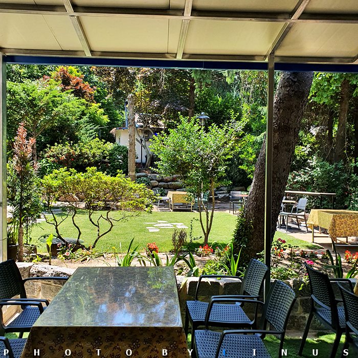 반 실내(?) 테이블과 의자들. 정원도 멋지다.