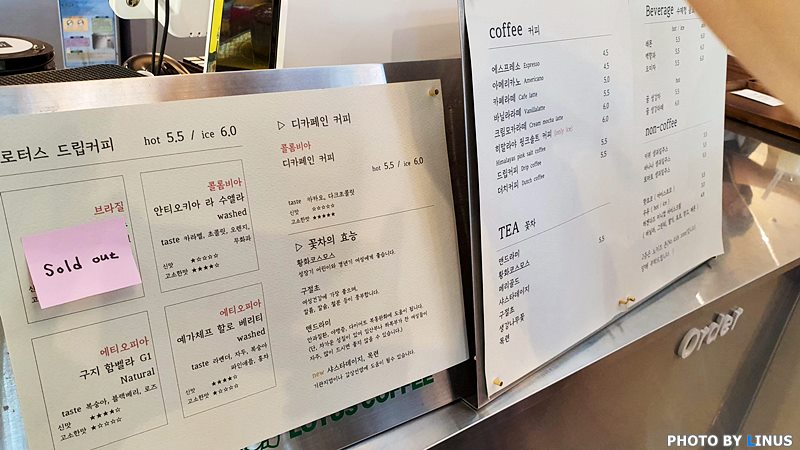 로터스 드립커피 따뜻한건 5.5천원 아이스는 6천원. 브라질, 콜롬비아 안티오키아 라 수엘라, 에티오피아 구지 함벨라 G1, 에티오피아 예가체프 할로 베리티 라이너스씨는 요즘 고소한 맛보단 커피 산미에 빠져있던지라 에티오피아 예가체프로....ㅎ 디카페인 커피와 황화코스모스, 구절초, 메리골드, 샤스타데이지,생강나무꽃, 목련 맨드라미 꽃차도 팔고있다. 수제청 음료는 레몬, 백향과, 오미자, 귤 생강차, 귤 생강라떼 등이 있다. 기타 메뉴로는 에스프레소 아메리카노 카페라떼 바닐라 라떼 크림모카라떼, 히말라야 핑크솔트 커피, 더치커피 등이 있는데 가격대는 4.5천원에서 6천원 사이.