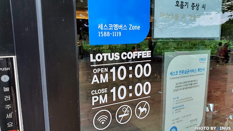 로터스커피의 영업시간은 오전 10시부터 오후 10시까지. 와이파이는 가능, 애완동물(반려견)이나 흡연은 금지다.