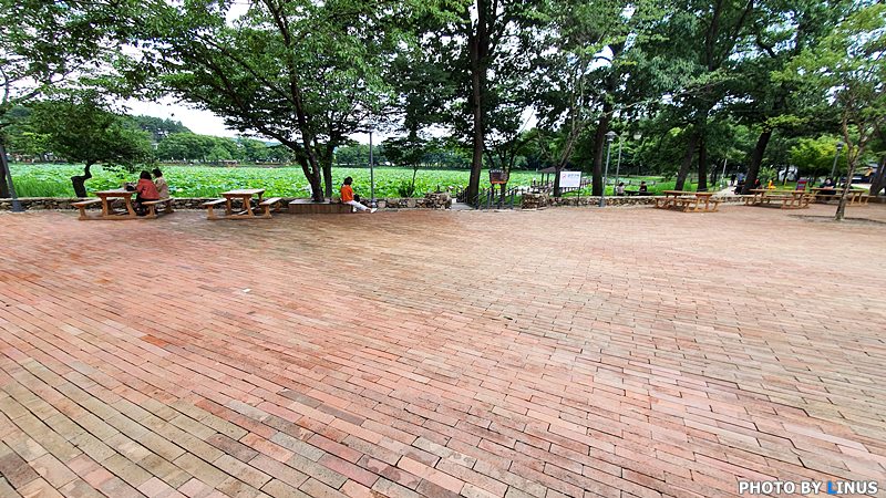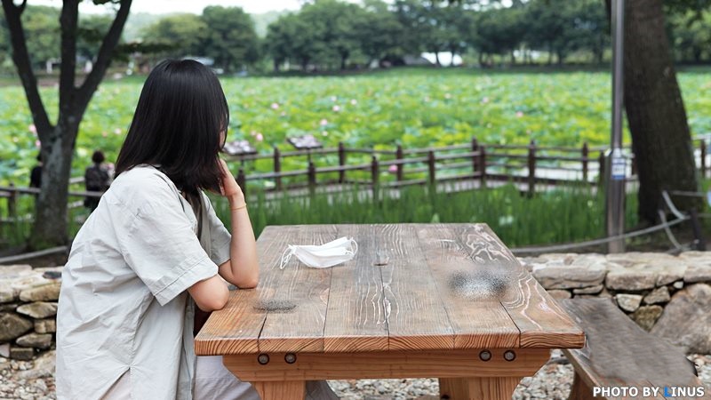 테이블 뒤편으로 강주연못 가는길이 펼쳐진다.