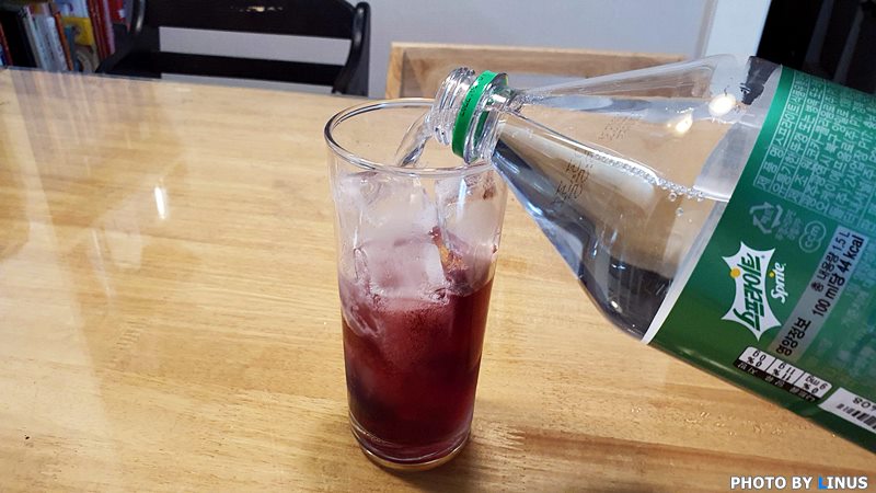 이제 사이다를 부어주자. 사이다가 없을때 긴급 처방으로 탄산수+설탕 2큰술(혹은 액상시럽 2큰술)도 괜찮다. 칠성사이다, 스프라이트, 세븐업, 킨 사이다 등 사이다의 종류는 다양한데 필자의 개인적인 취향으론 스프라이트와 칠성은 괜찮았는데 레몬향이 좀 더 들어간 세븐업이나 킨, 혹은 마트표 PB 사이다는 조금 별로 였던듯...^^;