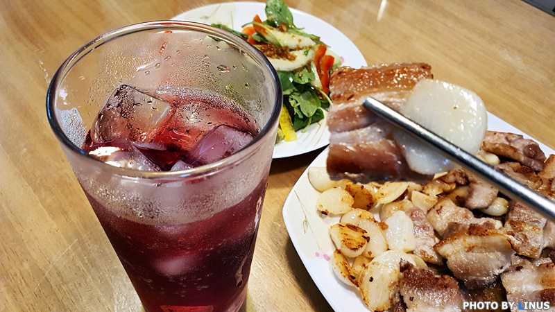 화이트와인은 생선류, 레드와인은 육류라는 공식이 있는데... 어차피 삼겹살도 육류. 레드와인 에이드와 무척 잘 어울린다.^^