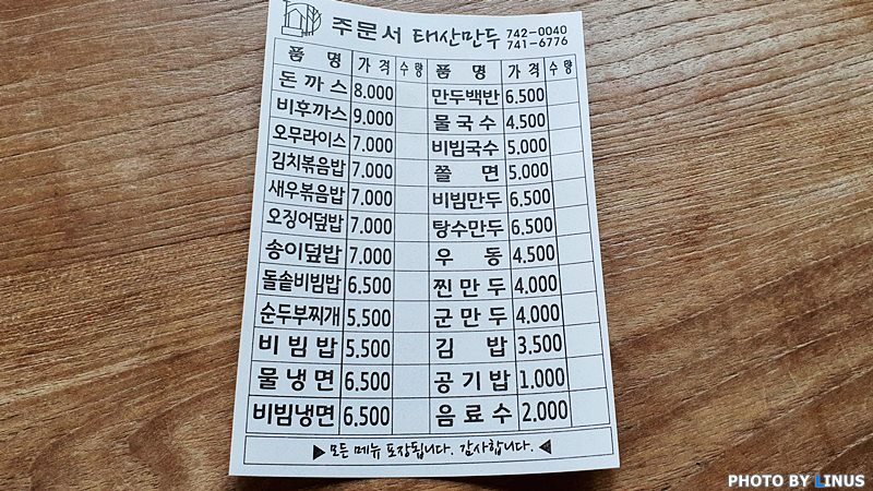 안으로 들어가 주문서를 받았다. 주문서에 메뉴가 표기되어있다. 돈까스, 비후까스, 오무라이스, 김치볶음밥, 새우볶음밥, 돌솥비빔밥, 순두부찌개, 비빔밥, 물냉면, 국수, 쫄면, 우동, 김밥 등... 다양한 음식들이 준비되어있다. 가격대는 4천원에서 9천원 사이로 저렴한 편. 필자는 태산만두의 명물인 돈가스와 태산만두의 시그니처(?)인 비빔만두를 주문했다.