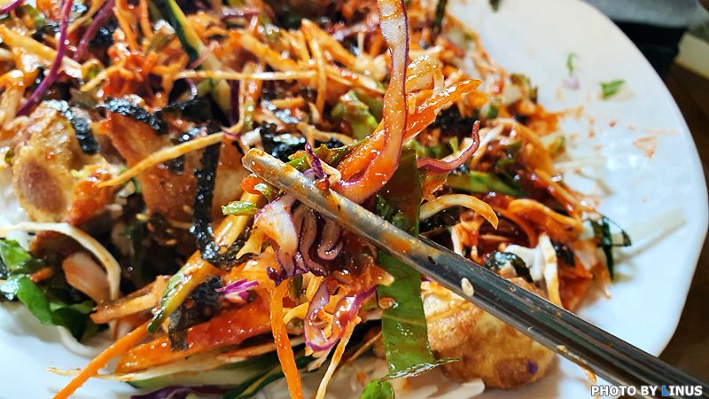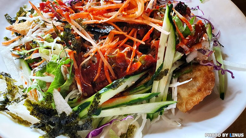 드디어 등장한 비빔만두. 맨 아래 깔려있는 만두와 위로 휘감듯이 쌓아올린 야채의 산이 예사롭지않다.