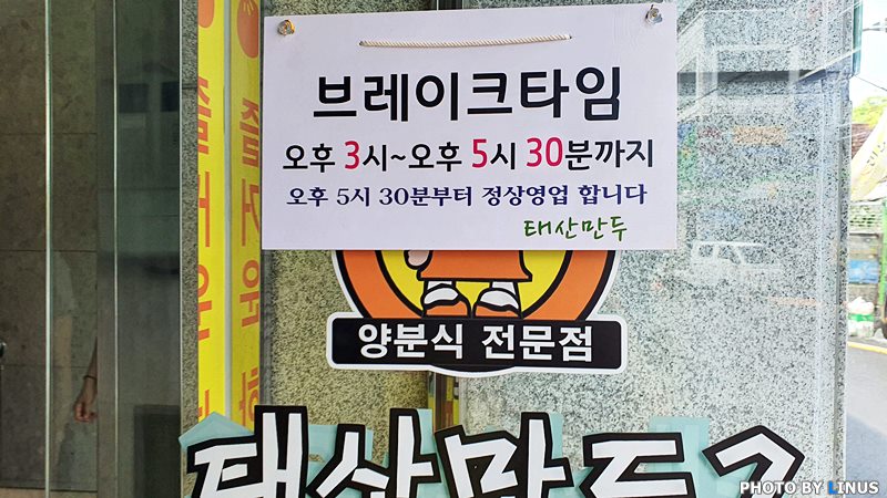 입구 쪽에는 브레이크 타임이 명기되어있다. 진주 태산만두의 영업시간은 오전 11시에서 밤 9시30분까지이며 브레이크타임은 오후 3시부터 오후 5시30분까지, 일요일은 휴무라고...